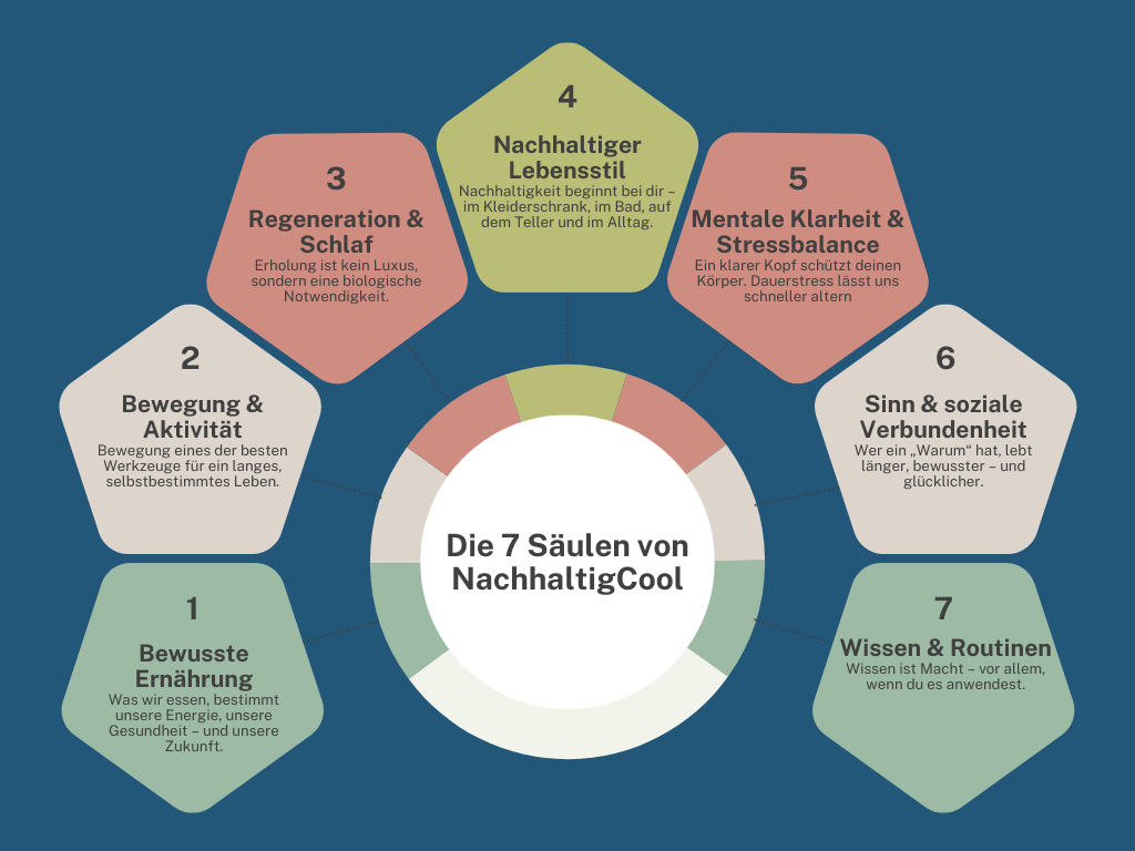 Auf NachhaltigCool geht es darum, wie Nachhaltigkeit und Langlebigkeit Hand in Hand gehen und warum beide für Deine Zukunft entscheidend sind. Schau Dir an, wie die 7 Säulen harmonisch zusammenwirken können und vernetze dich mit Gleichgesinnten um Dich auszutauschen.